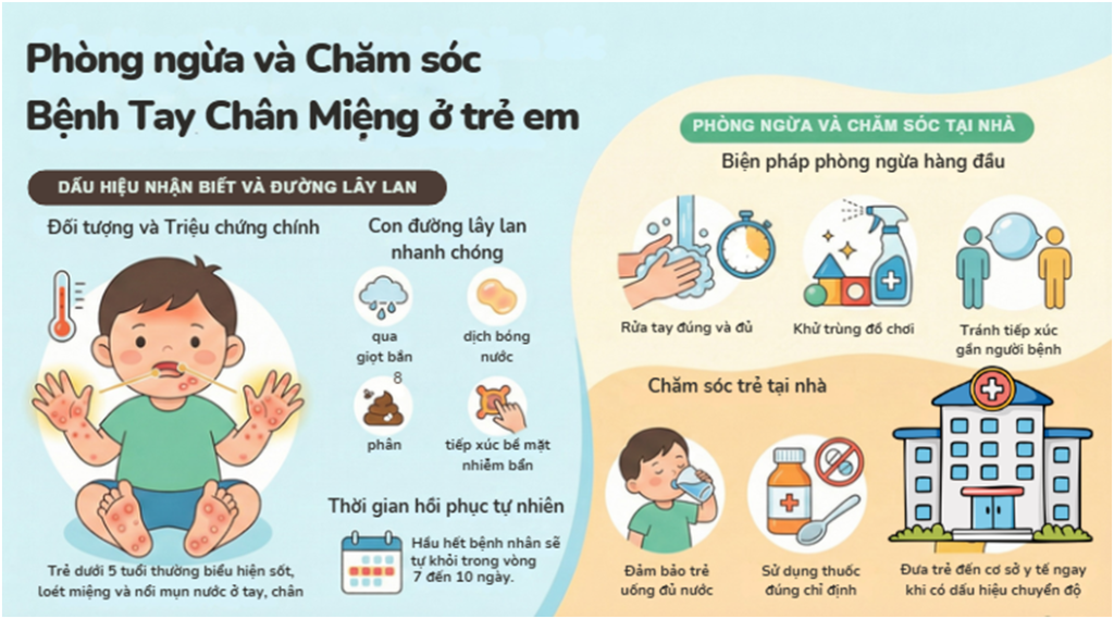 Bệnh Tay Chân Miệnglà bệnh phổ biến nhưng có thể phòng ngừa và kiểm soát tốt khi phát hiện sớm và chăm sóc đúng cách. Nếu có bất kỳ dấu hiệu bất thường, hãy đưa trẻ đến cơ sở y tế để được tư vấn và theo dõi.